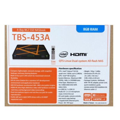 Compact, near-silent, and versatile, the 4-bay M.2 SSD NASbook TBS-453A is ideal for office meetings and multimedia applications. Featuring a quad-core Intel® 1.6GHz processor, a built-in 4-port network switch, and using up to 4 M.2 SSDs for storage, the TBS-453A not only provides full-fledged NAS functions with RAID protection, but also can act as a switch and share network access with multiple users regardless of being powered on or off. Coupled with its dual HDMI output and 4K H.264 video display & transcoding abilities, the TBS-453A can easily be carried to meetings to present stored files and quality multimedia content. The TBS-453A also supports the open-source Linux® platform that allows you to directly utilize feature-rich Linux® apps, enjoying a private cloud combining storage and IoT applications.